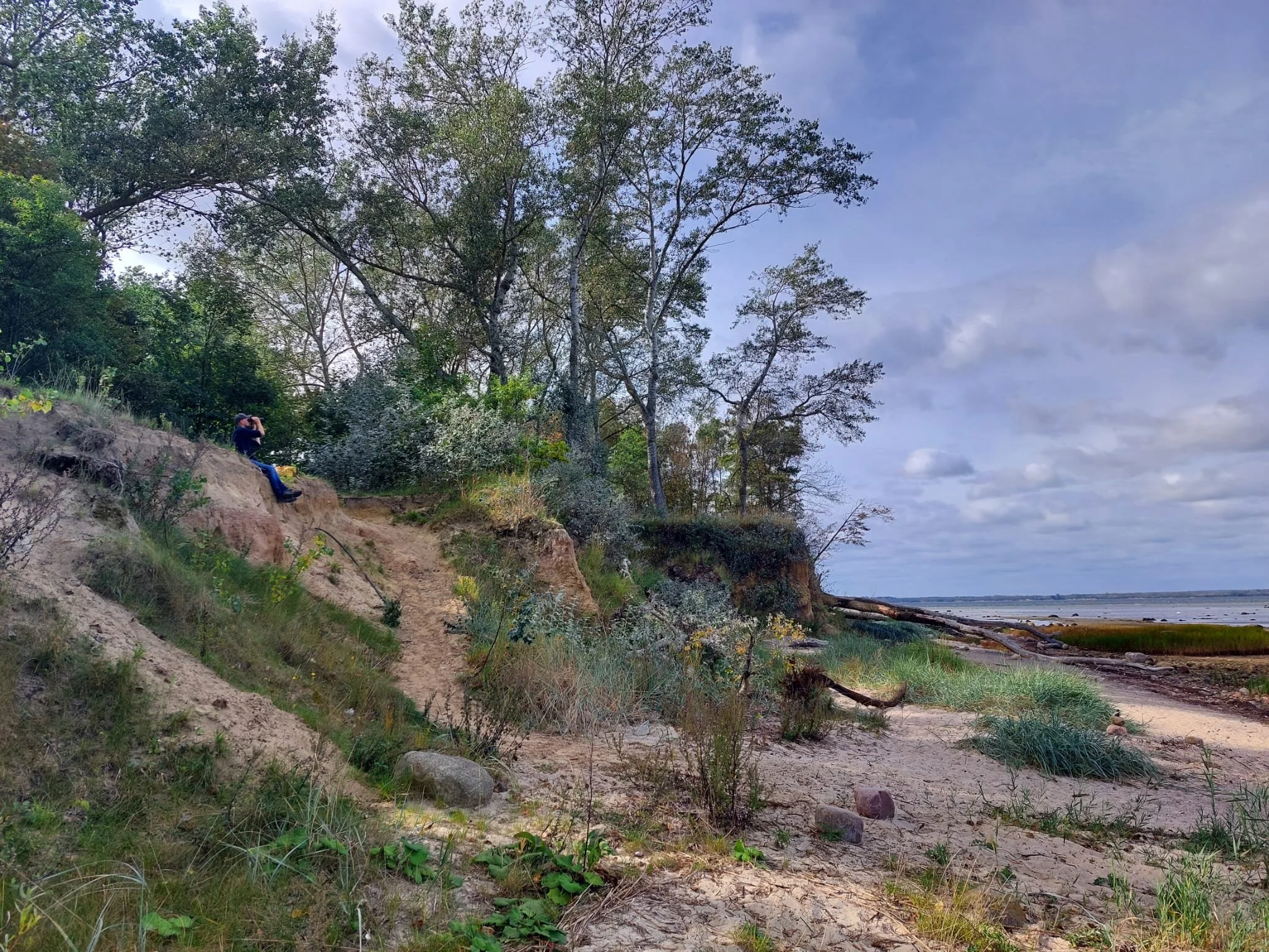 Der dünne Pfad durch den Küstenwald ist gesäumt von Hagebutten, Schlehdorn und Hopfen - der Herbst kündigt sich in an diesem Tag in satten Farben an. Zu Beginn unserer kleinen Wanderung war es noch windig und frisch, doch inzwischen ist es nochmal richtig warm und sonnig geworden. Und während wir so umherstreifen, den weiten Blick über das Meer, die Steilküste, Flora und Fauna genießen und die Schönheit dieses Ortes an diesem wunderbaren Tag regelrecht aufsagen, vergeht die Zeit wie im Fluge. Aus geplanten anderthalb Stunden für die circa fünf Kilometer lange Strecke sind mal eben dreieinhalb Stunden geworden. Und noch immer erschien uns die Zeit zu kurz. Wir müssen wiederkommen, schon bald!