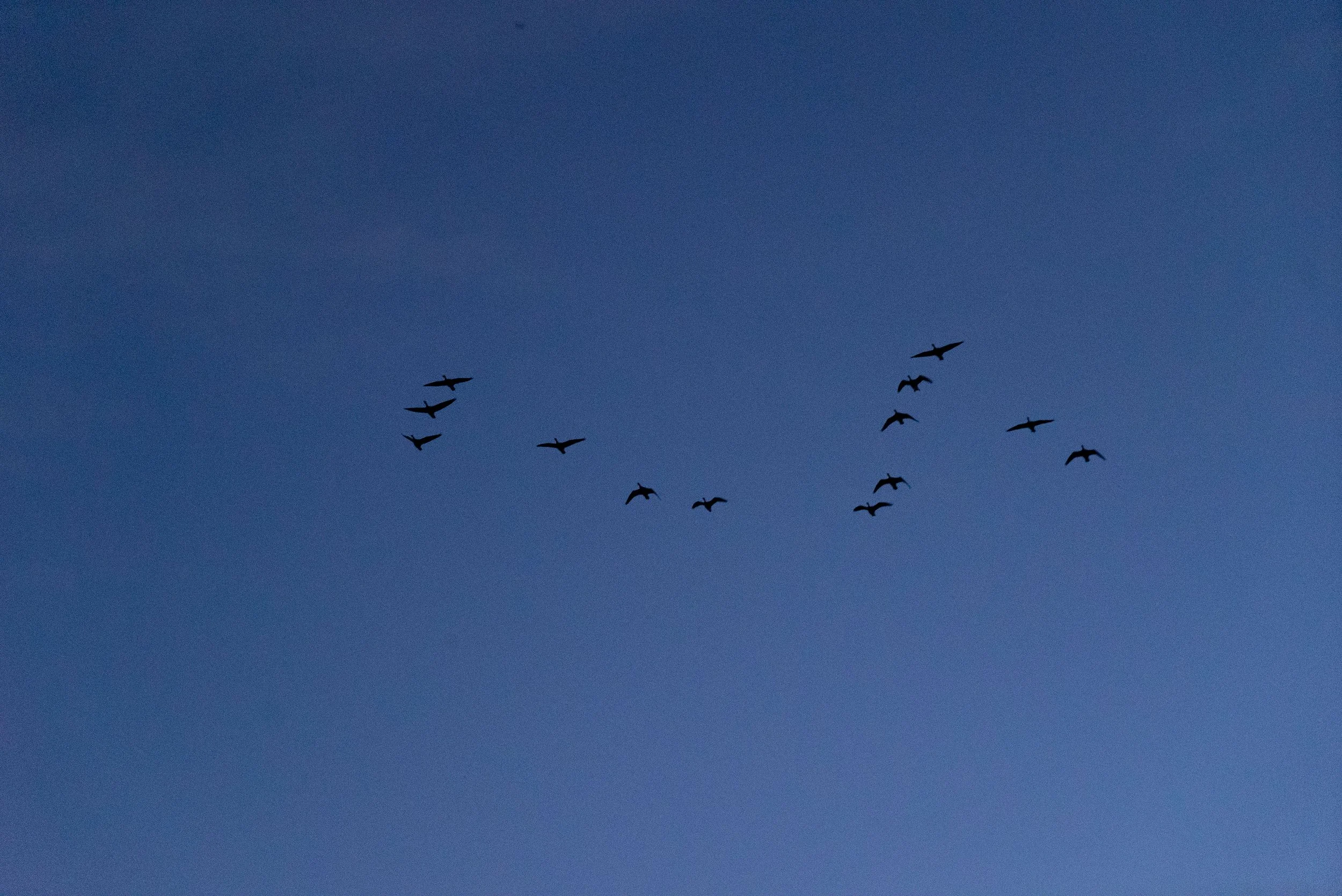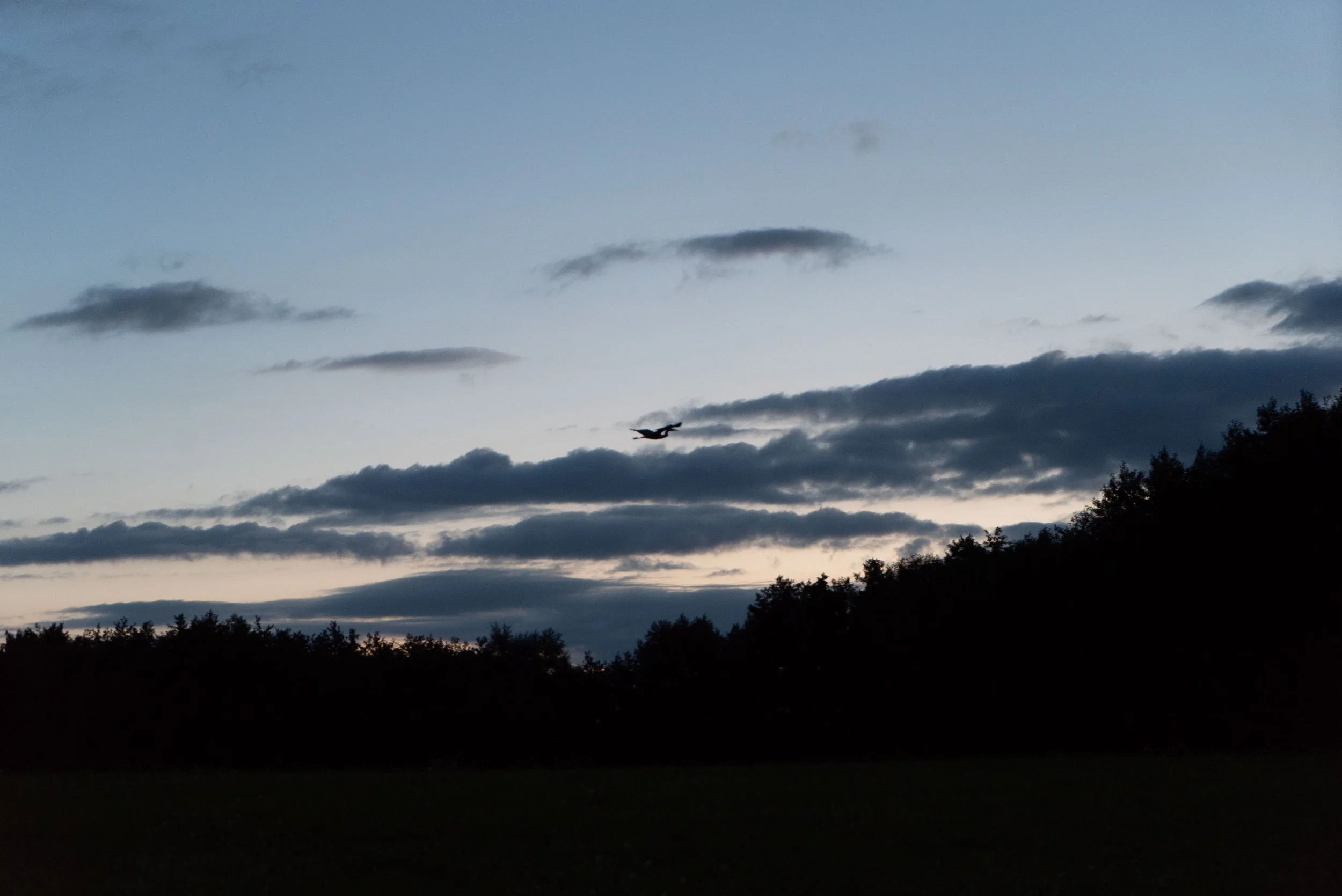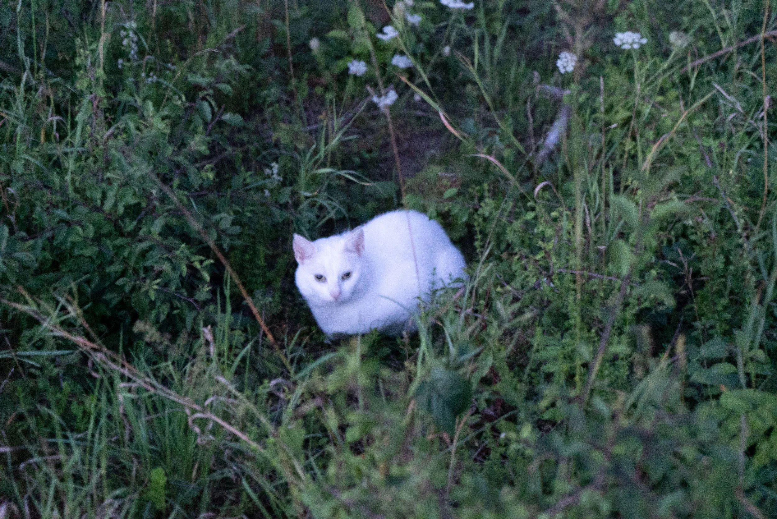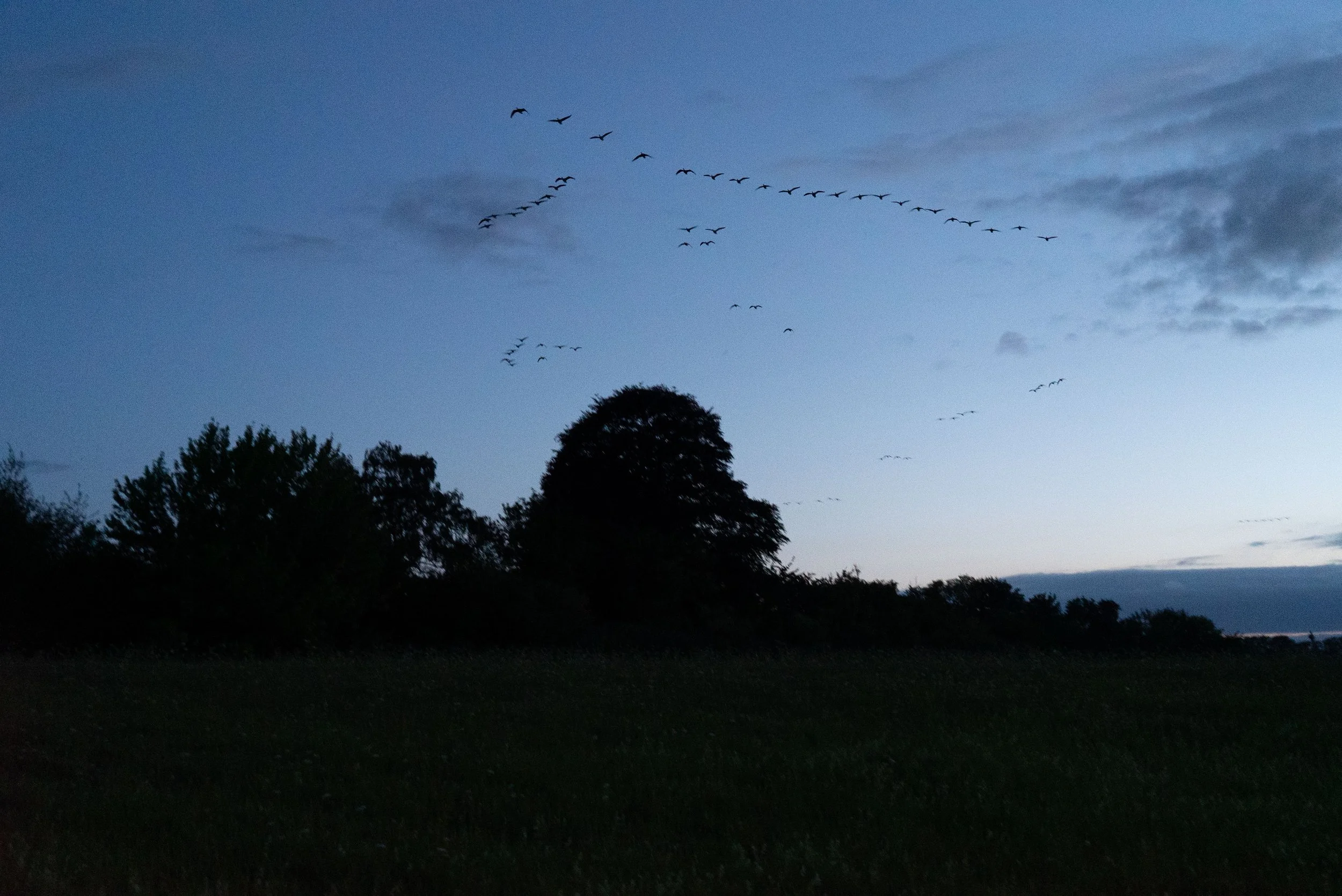 Inzwischen ist die Nacht hereingebrochen und ich beschließe in Richtung meines Fahrrades zu laufen, um später nicht in totaler Dunkelheit über die Wiese zu stolpern. Es scheint die Stunde der Gänse geschlagen zu haben. Unzählige fliegen nun in geringer Höhe in Formation über meinen Kopf. So niedrig, dass ich ihr Flügelschlagen deutlich hören kann. Glücklich über diese schönen Begegnungen gehe ich zurück zu meinem Fahrrad. Zum Abschluss sitzt dort eine Albino-Katze, die sich von mir überhaupt nicht stören lässt und den Abend im hohen Gras zu genießen scheint.