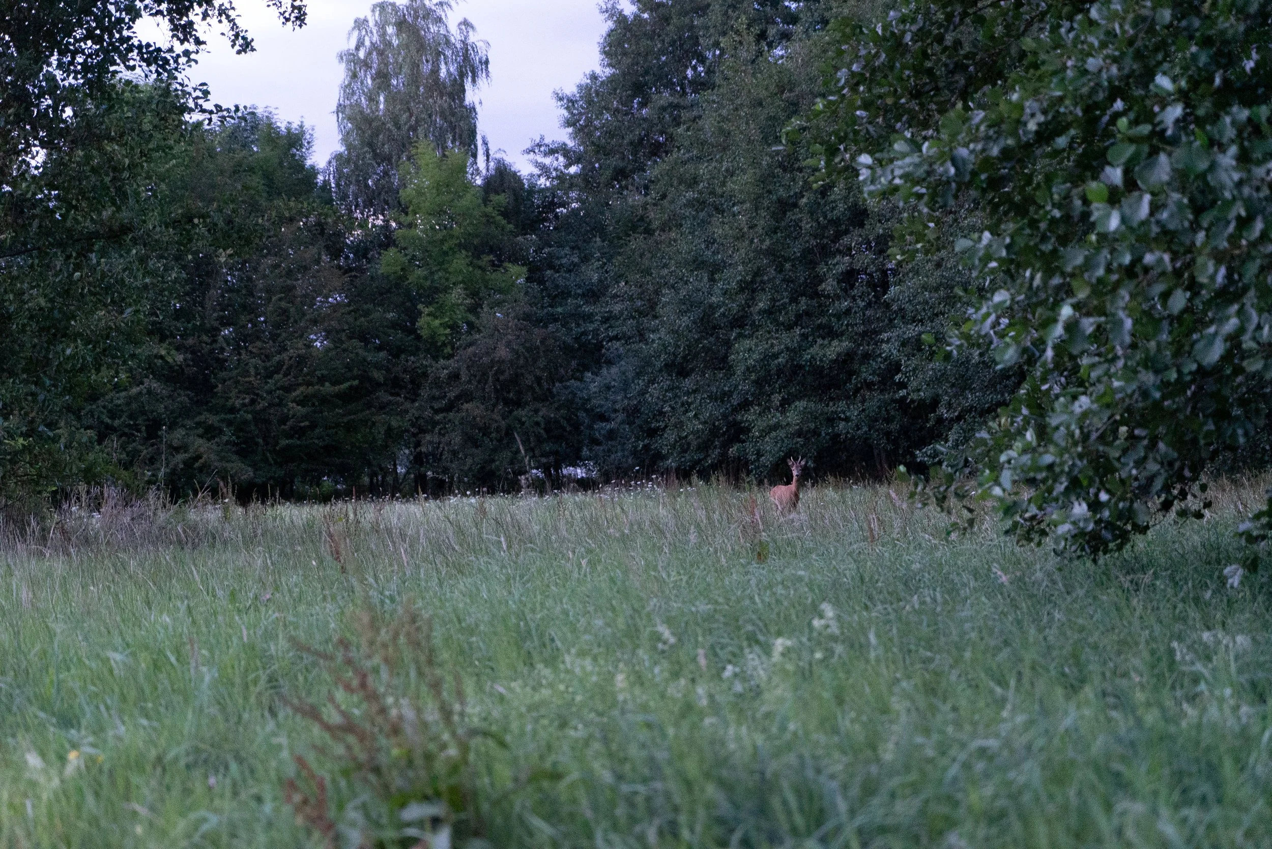 Ich lasse meinen Blick schweifen und entscheide mich, weiter um den Teich herum zu gehen. Schon vor einigen Tagen war ich vormittags mit den Kindern hier und auch da hatten wir das Glück, Rehe zu sehen. Ich setzte meinen Weg in Richtung einer Blutbuche fort, als ich auf einen Wildwechsel (von Tieren ausgetretener Trampfelpfad) stoße und diesem folge. Doch schon nach einigen Metern durch das Unterholz werden die Büsche zu dicht und die Mücken zu aufdringlich, sodass ich den Rückzug antrete und lieber wieder über die offene Wiese umherstreife.